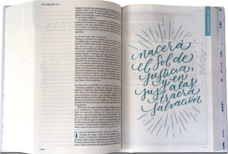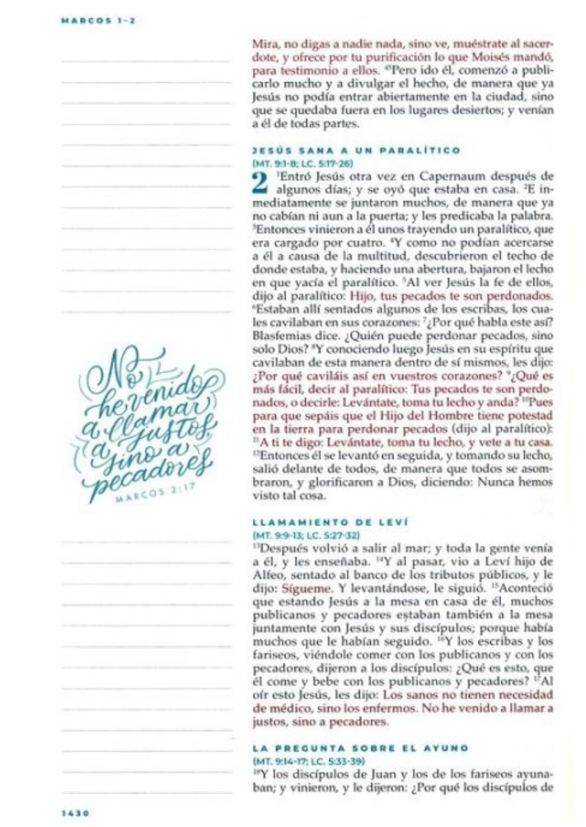 - Amplios márgenes que facilitan la toma de notas y donde puedes plasmar tus pensamientos y oraciones, o dibujar tus versículos favoritos.