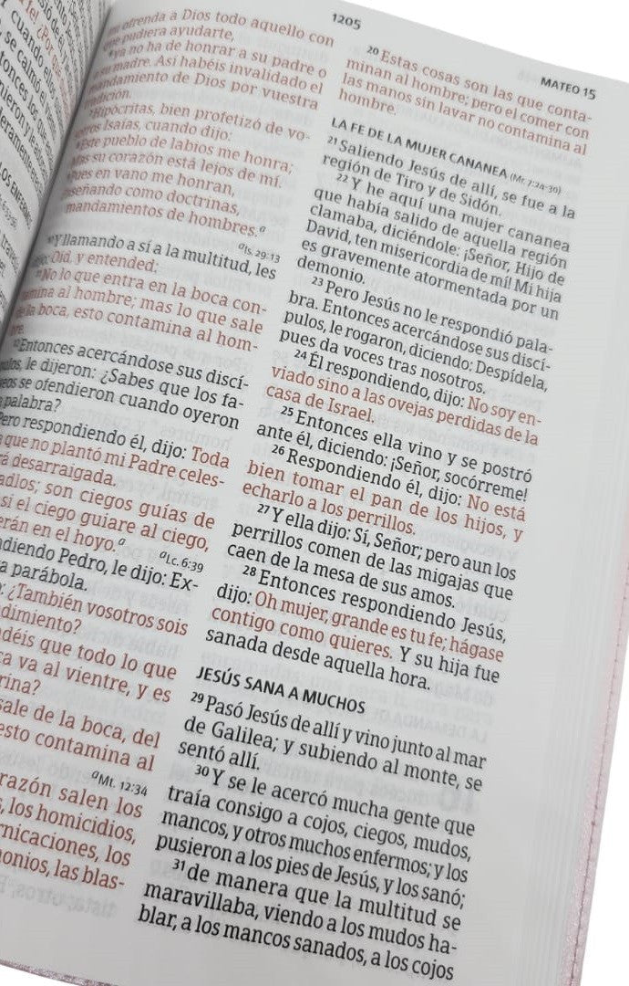 Esta Biblia combina un diseño legible y práctico, con un tipo de letra estético y cómodo para el lector.