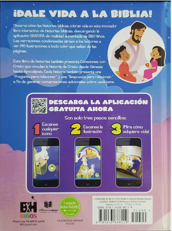 Este libro de historias bíblicas para niños trae a la vida la Palabra de Dios de una manera nueva, para que los niños puedan aprender cómo Jesucristo es el hilo conector de la Biblia. Entender este concepto importante a temprana edad formará el crecimiento espiritual del niño y aumentará su fe. Cuéntales a los niños la gran historia de Dios con este libro innovador e interactivo de historias bíblicas. Incluye 145 historias acompañadas de originales ilustraciones a todo color, una sección de «Conexión con Cristo» que les muestra a los niños cómo el plan divino de salvación mediante Jesús aparece en toda la Biblia, y una aplicación gratuita de realidad aumentada que hace que la ilustración y la historia cobren vida tanto en lo visual (en 3D) como en lo auditivo.